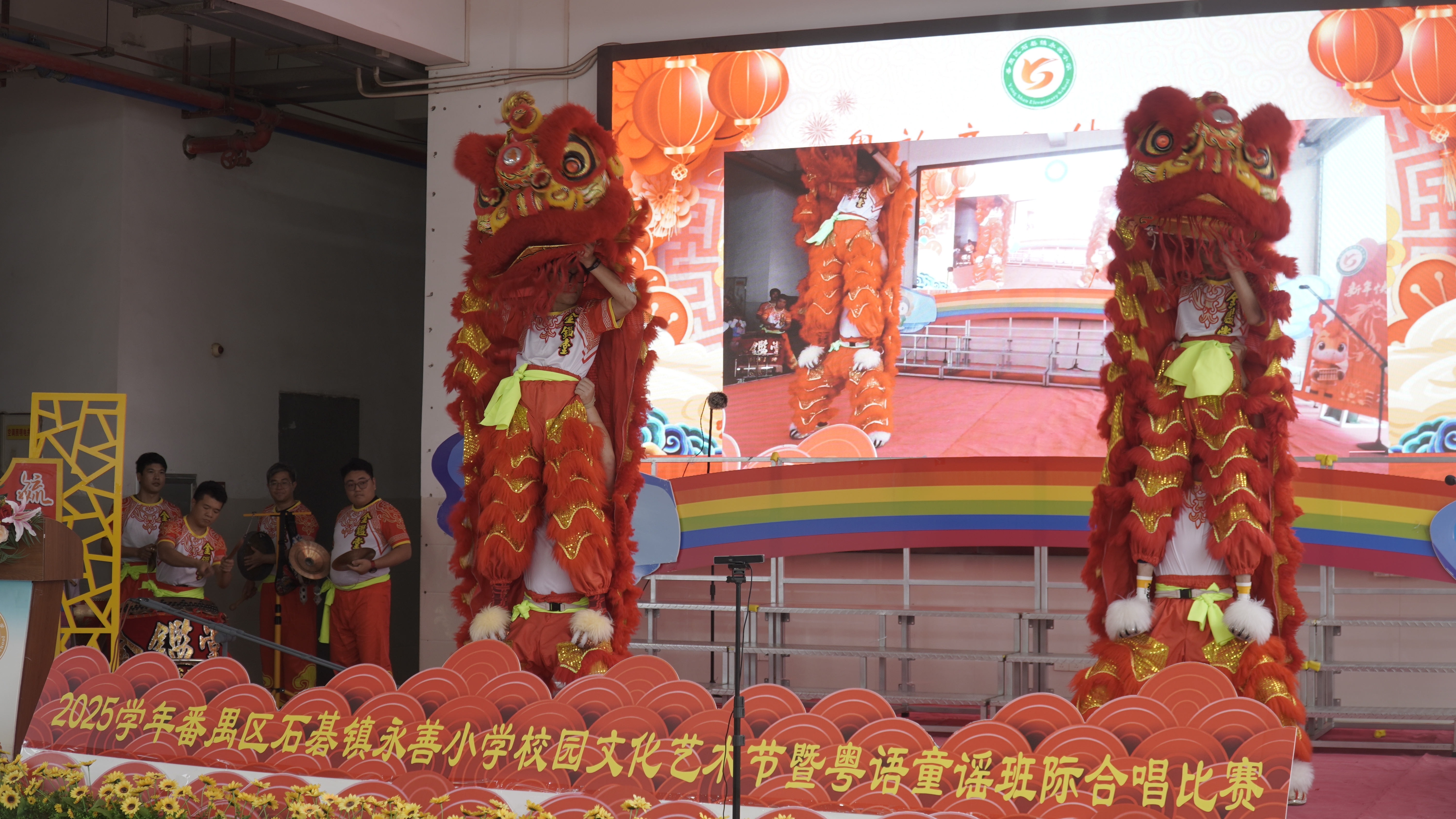 本届艺术节以“学科融合”为鲜明特色,鼓励各班将粤语童谣与语文、数学、英语、美术、体育等学科知识创造性结合,生动诠释了学校“五育并举、融合育人”的教育理念。活动伊始,铿锵有力的醒狮表演率先登场,醒狮腾挪跳跃、威风凛凛,瞬间点燃全场热情,台下欢呼声、喝彩声此起彼伏。